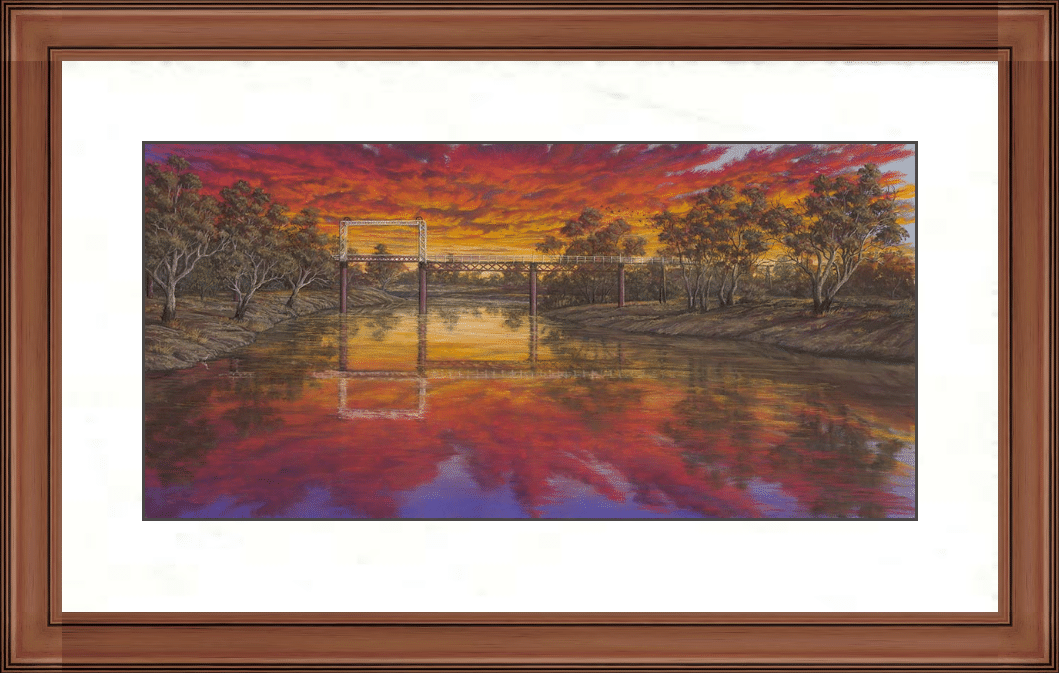 Lifeblood of the West is a striking piece of Australian landscape art by Jenny Greentree, featuring the iconic North Bourke Bridge at sunset. Reflected in the tranquil Darling River, the fiery outback sky fills the scene with colour and energy. This powerful work of outback art celebrates the river as the true lifeblood of western communities and landscapes.
